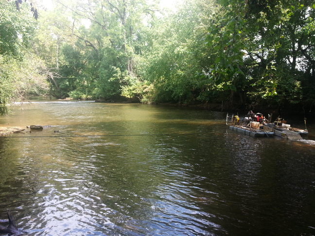 Come to find out there is a guy digging for gold in that shallow, lazy river. That contraption is a dredging machine that digs dirt up from the river bottom and runs it through the sluice box there where you see water coming out of the back. He says he's been a gold digger for 30 years and found a nice nugget just the other day. He says he finds lots of old silver coins from the early 1900s too.